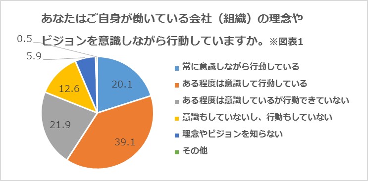 「あなたはご自身が働いている会社(組織)の理念やビジョンを意識しながら行動していますか」という設問に対して、全体の20.1%が「常に意識しながら行動している」と回答。また、全体の約6割が「常に」または「ある程度」意識して行動をしていることがわかった。(図表1)