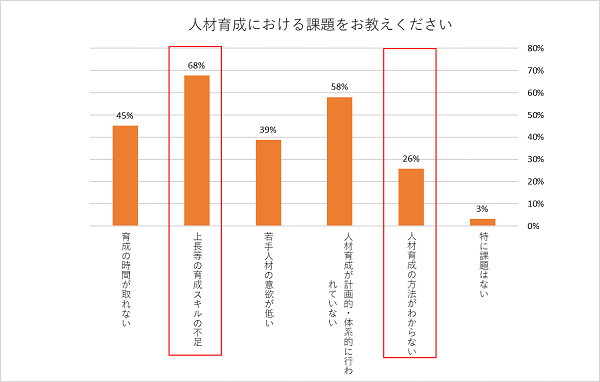 実際に、今回のセミナーの受講者アンケート集計によると、人材育成における課題について68%の企業が「上長等の育成スキルの不足」、26%の企業が「人材育成の方法がわからない」と回答しています。