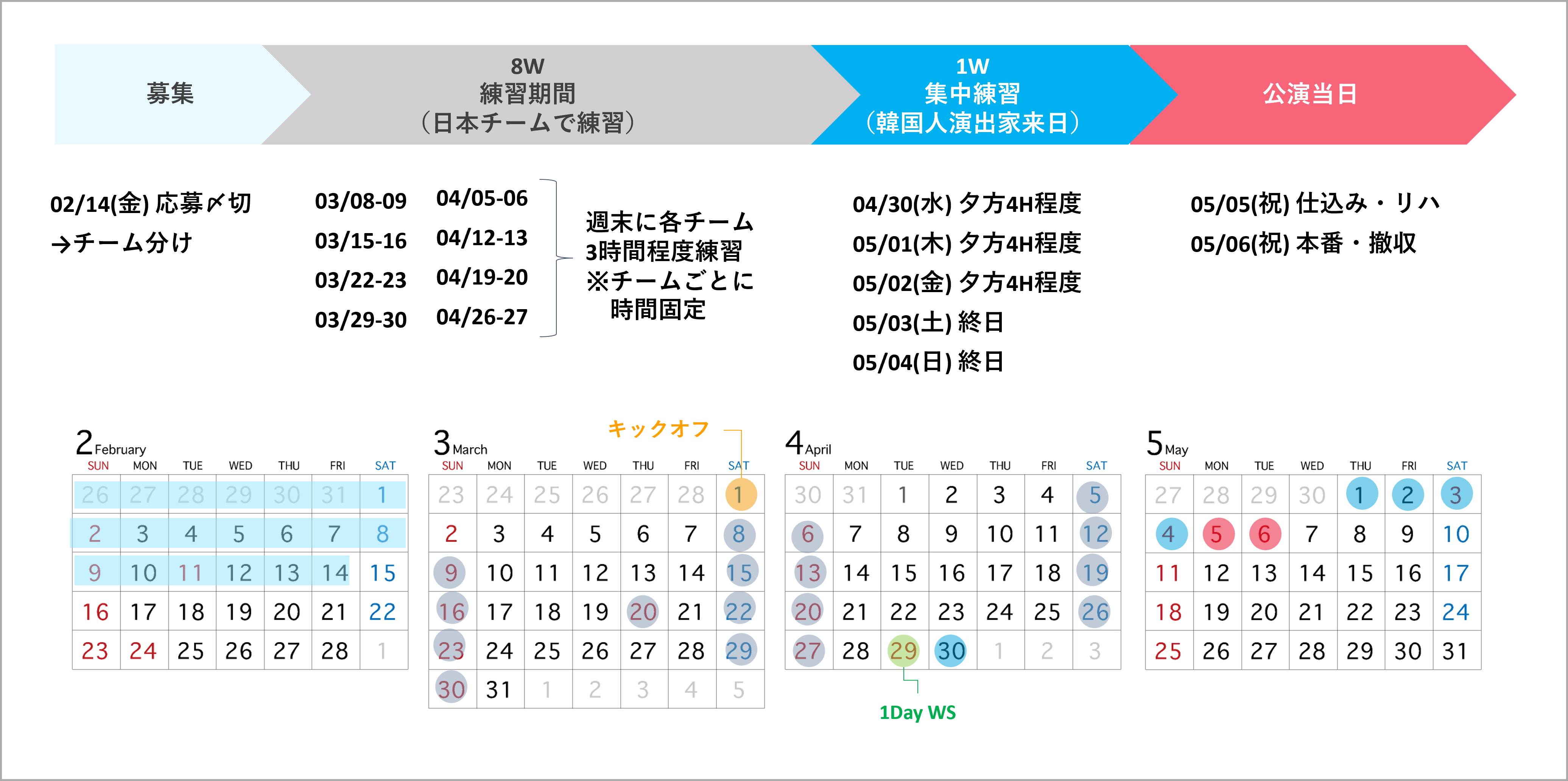 内容: 2か月間の練習、およびGW期間の集中練習(韓国人演出家指導)を通して韓国ミュージカル曲を含むミュージカルショーを完成させ、上演する