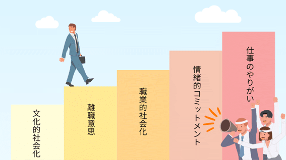 組織内のルールや価値観を身つけると離職意思が低下し、必要なスキルを習得して業務を遂行できるようになります。そうして業務に取り組む中で、組織に対する誇りや愛着、仕事のやりがいといった情緒的コミットメントが生まれるのです。