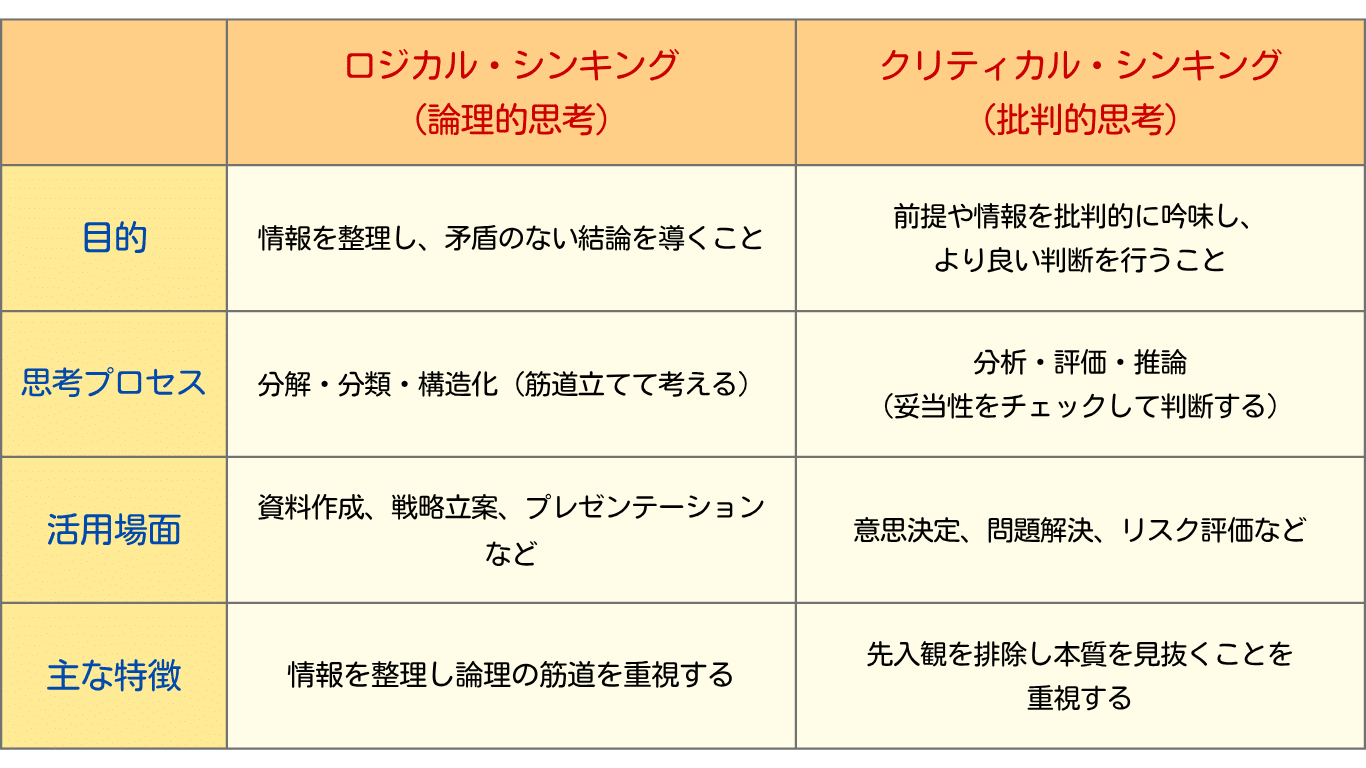 どちらもビジネスパーソンに求められる重要な思考法ですが、クリティカルシンキングではロジカルな思考力を土台に、「その結論や前提は正しいのか?」と一歩踏み込んで考える姿勢がポイントになります。論理的に筋道が通っているだけでなく、そもそもの前提条件や情報の質自体を疑い、必要に応じて修正することで、意思決定の質をさらに向上させることができるのです。