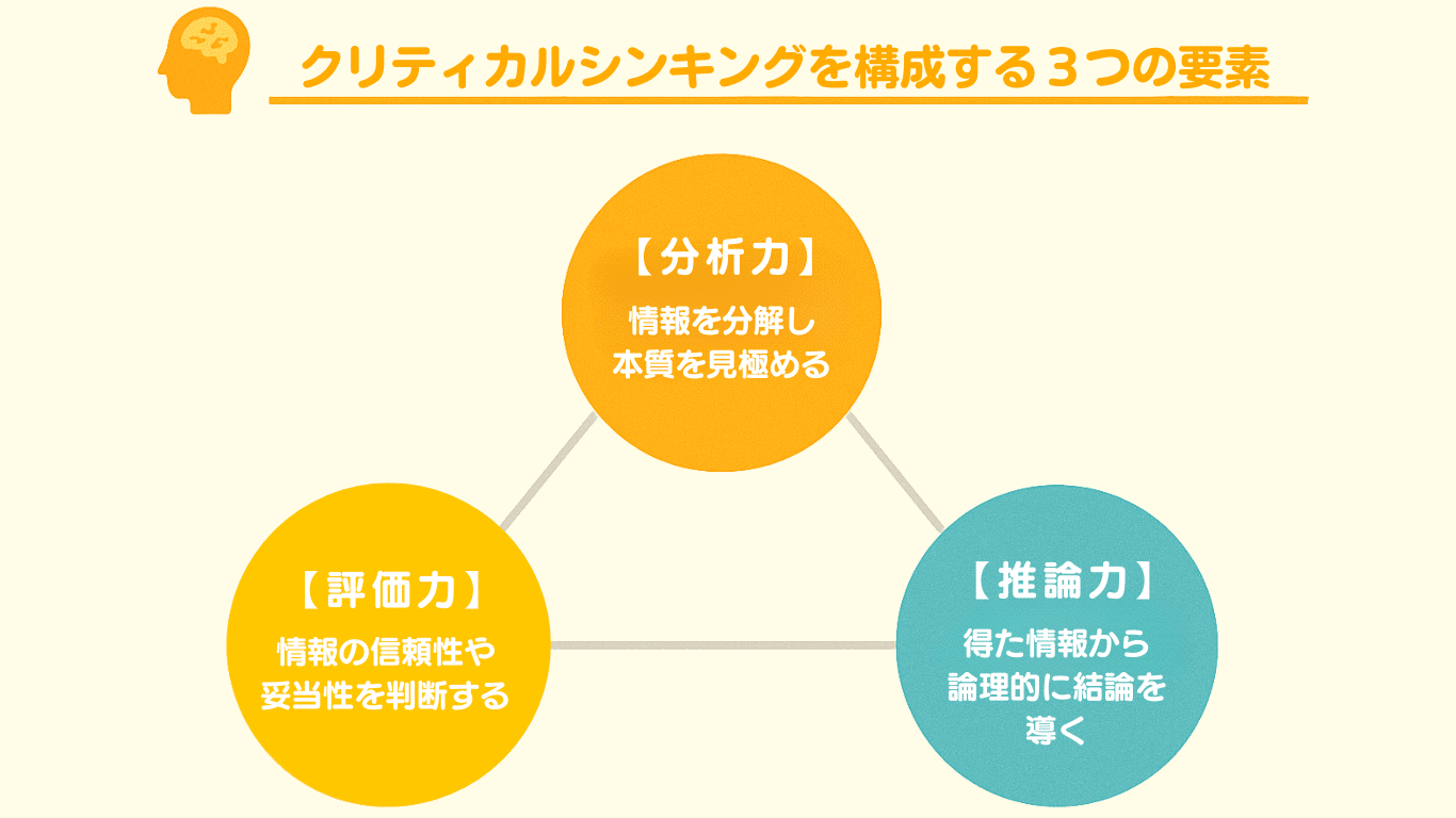 では、クリティカルシンキングの内容をもう少し具体的に見てみましょう。批判的思考力には、大きく分析力(情報を分解し本質を見極める)、評価力(情報の信頼性や妥当性を判断する)、推論力(得た情報から論理的に結論を導く)の3つの要素が含まれるとされています。