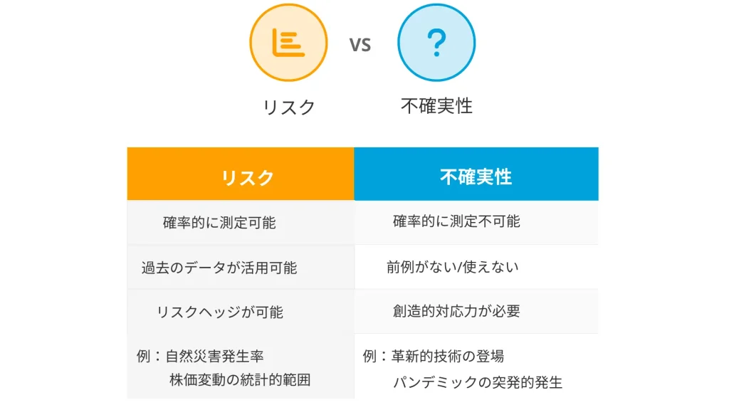 一方で、将来どんな革新的テクノロジーが登場するか、突発的なパンデミックや突如の政変が起こるかといった予測不能な事象=真の不確実性も存在します。このような不確実性には確率論的な対処が難しく、柔軟な対応力や創造的な問題解決能力が求められるでしょう。