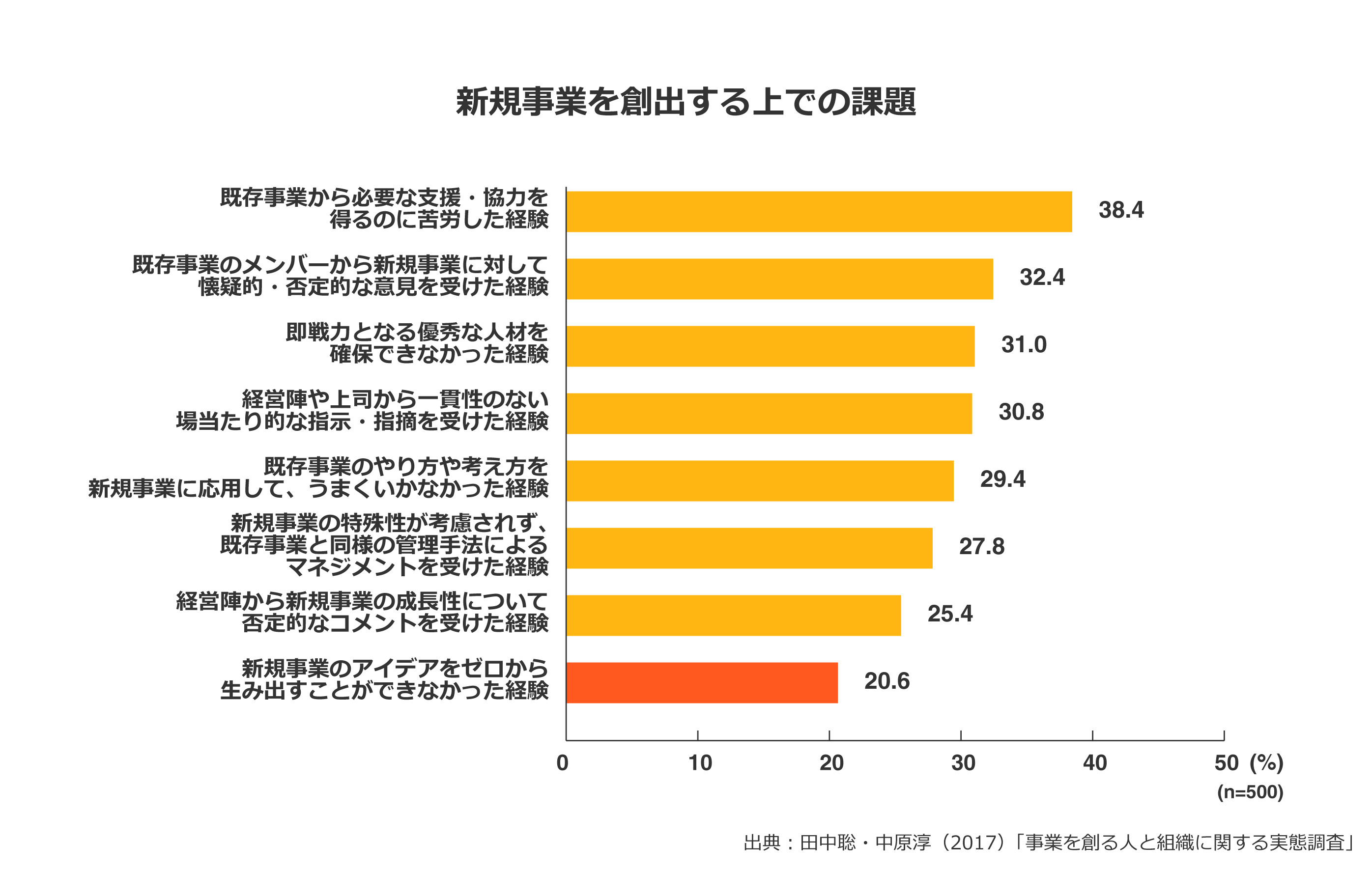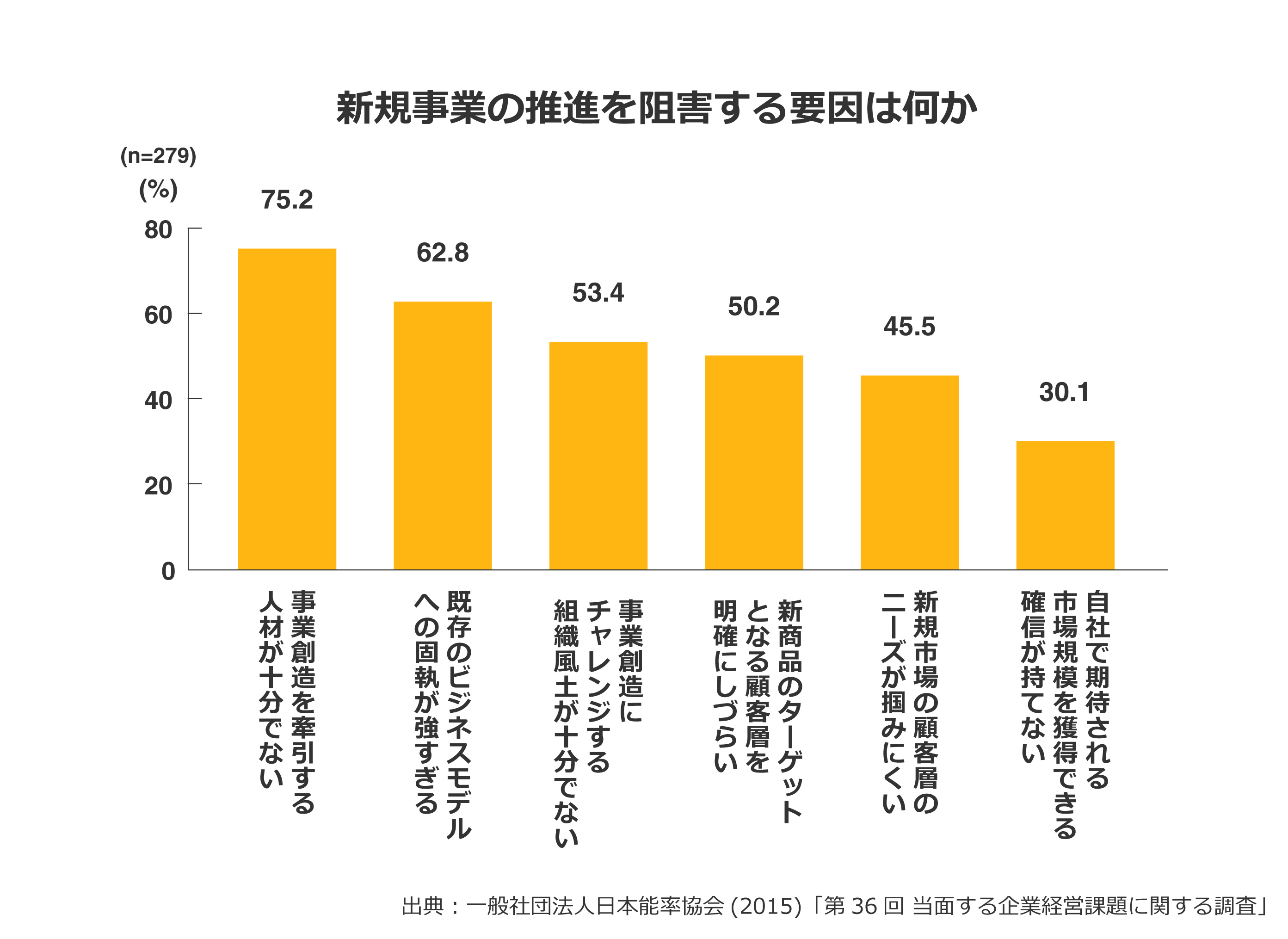 このアンケートの調査結果では半数以上の回答者が上記の3項目を阻害要因として認識しています。中でも75.2%と最も多いのが「事業創造を牽引する人材が十分でない」なので、新規事業推進の担当者が「人を育てる」「チャレンジする機会をつくる」という人材育成の視点を持つこと自体は、間違いではありません。しかし、人材面だけでなく「既存事業への固執」「組織風土が不十分」といった組織の問題も無視できません。