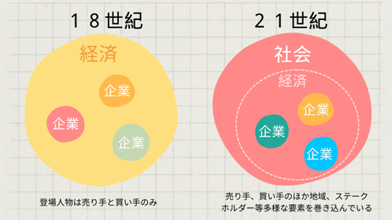 パーパスは、企業の「存在」を経済の中だけにとどまらず、社会全体の中に「存在」を置いた概念です。近代経済学の父であるアダムスミス18世紀以降の経済の登場人物は、通常、市場参加者という場合、売り手と買い手だけに注目しがちです。いわゆる古典派経済学の学者たちもこの二人以外の要因を考えていませんでした。つまり、彼らにはマーケットを分析する力はあっても、マーケットを取り囲む環境や自然への視点がなく、例えば、工場から環境汚染に対して、一言もありません。しかし、経済活動は、社会や自然の活動を考慮しなければ立ち行かず、この意味において、環境や社会を含めた経済学というものは、20世紀を待たねばなりませんでした。現在の経済学が社会学や環境を取り入れている事とSDGsやESGというサスティナブルという概念を企業が取り入れることは必然とも言えます。