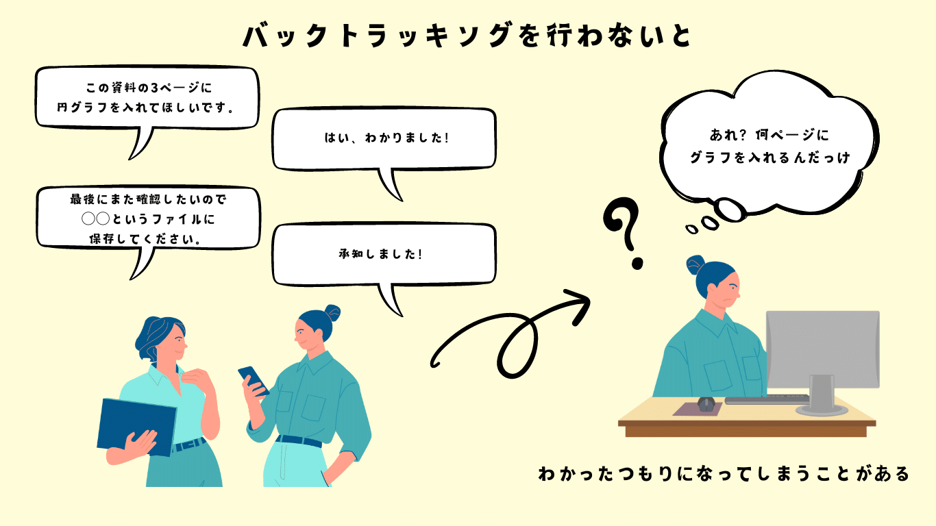 バックトラッキングは「オウム返しのように、相手の言ったことをそのまま返す」という方法で、カウンセリングでも用いられています。例えば、「○○ということがあったんだ」と相手が話したら、「○○ということがあったんですね」のように返すというやり取りです。