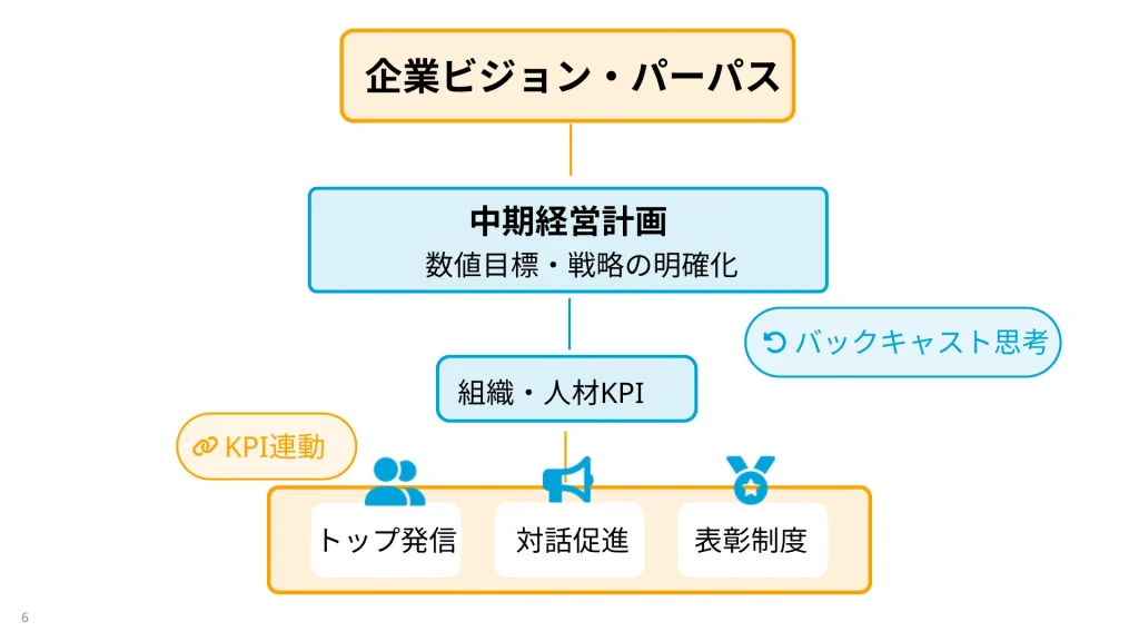 推奨するアプローチは、ビジョン浸透の目的を「中期経営計画(中計)の達成」に据え、その実現に必要な組織・人材の状態を逆算して定義する方法です。一般的な「ビジョン→戦略→計画」という順序を、計画側から補完的に逆引きする発想であり、現実のKPIと結び付けることで社内の納得度を高められます。