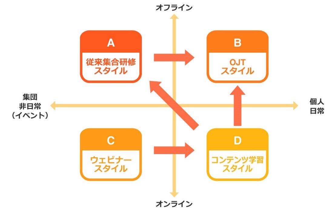 また、オンライン研修は、受講者が学習した内容を活用する場面に近づけることを可能にします。例えば職場からオンライン研修を受講して、そこで学んだことをすぐに業務で実践したり、逆に、日常業務における経験を学習に転換させるために必要な学習コンテンツや講師フィードバックをオンラインで提供したり、するということもできます。