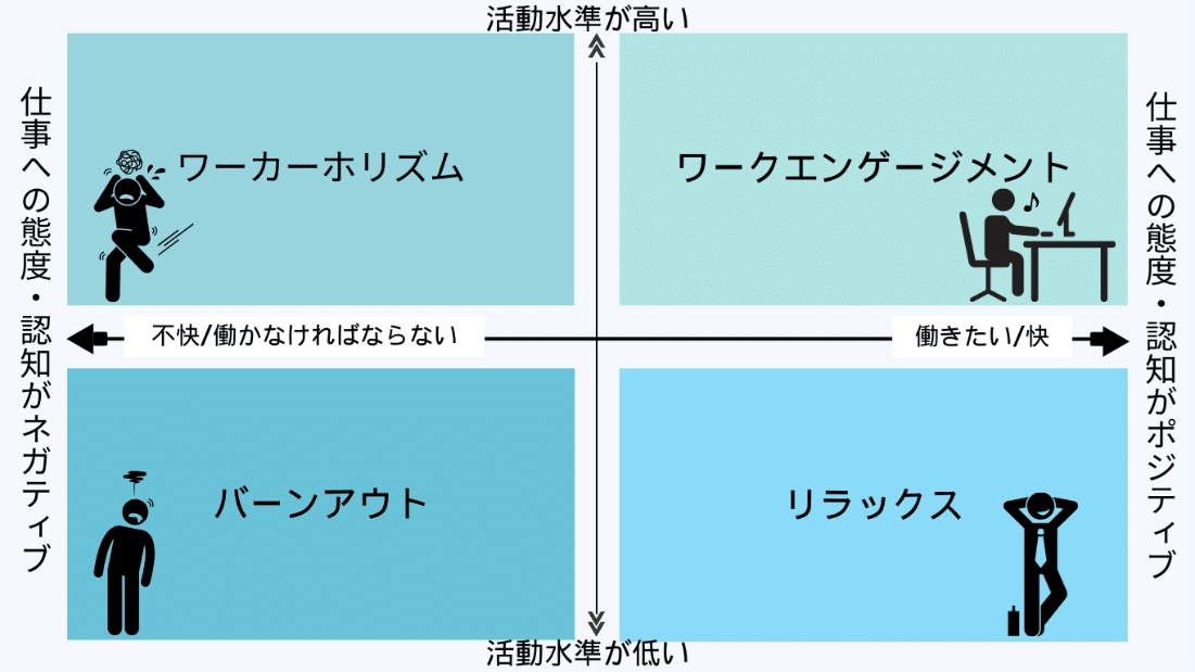 没頭:仕事にのめり込んでいる時の幸福感、時間が早く経つ感覚、仕事から頭を切り離すのが難しい感覚などがある状態であり、仕事に熱心に取り組んでいる
