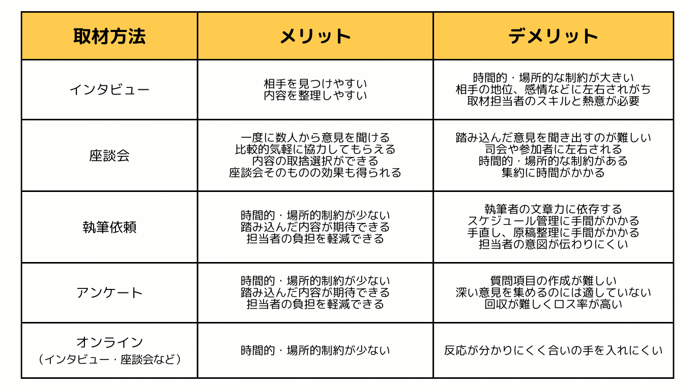 また、取材方法も必要な情報を得るために考慮しなければならない要素の一つです。下記の図を参考に適切な方法を選択するとよいでしょう。