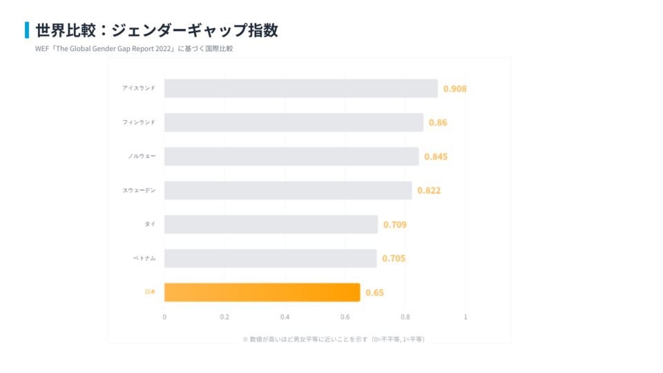 これによると、日本のジェンダーギャップ指数は0.650、調査対象となった全146ヶ国中で116番目の成績となっています。トップのアイスランドの指数は0.908、日本との差は0.258ポイントです。上位には北欧や欧州諸国が名を連ねていますが、タイ、ベトナム、インドネシアといったアジア諸国も0.7前後の数値を示しています。