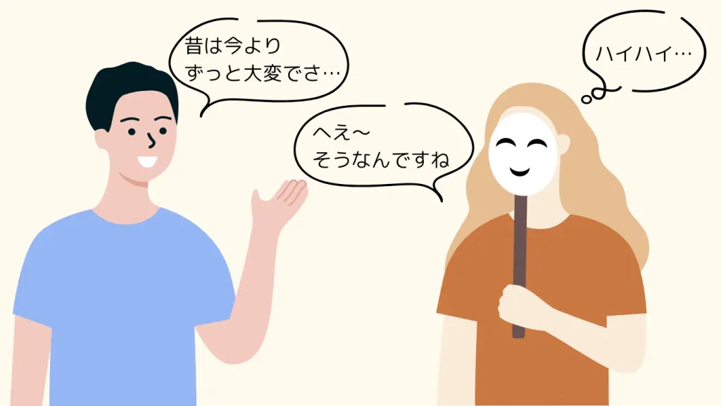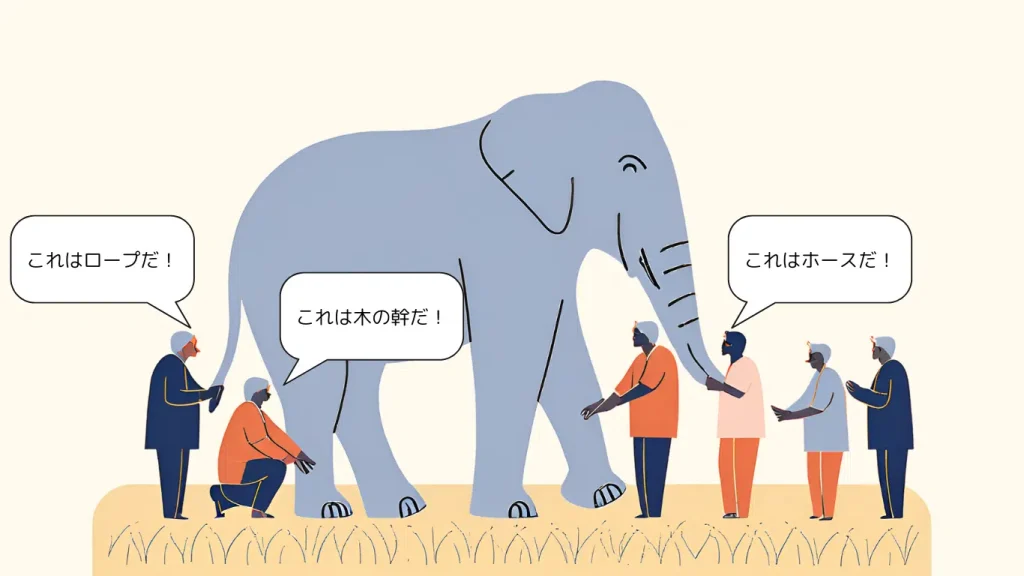 「群盲象を撫でる(ぐんもうぞうをなでる)」という故事があります。複数の盲人が象の異なる部分に触れ、それぞれの限られた感覚から象を別のものだと判断してしまう寓話で、物事の一部しか知らないまま全体を分かった気になってしまう危険性を示しています。この話は、限られた視野の人間同士が自分の観点だけで物事の本質を見失う様子を表現しており、コミュニケーションの重要性を示唆しているとも言えます。盲人たちは互いに触れた情報を交換することで初めて、それまで「ロープだ」「木の幹だ」と思い込んでいた対象が「象」だと理解できます。コミュニケーションも同様に双方向性を持ち、相互に情報をやり取りすることで共通の認識が形成されていきます。お互いに同じ前提を持っていれば対話はスムーズですが、コミュニケーションの過程で新たな共通認識(前提)が増えるほど相互理解が深まるのです。逆に前提や共通認識がないままでは会話が噛み合わず、一度ズレた認識を修正するのは容易ではありません。そのため、お互いの前提を確認しながら丁寧に対話を進める姿勢が重要となります。