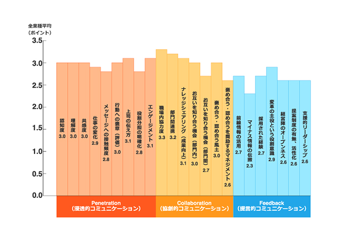 上の画像は弊社で実施している「社内コミュニケーション調査(PCF調査)」の各社平均のデータです。社内のコミュニケーション・情報流通・関係性の状況を、「Penetration:トップダウン・浸透的コミュニケーション(オレンジ色の項目)」「Collaboration:コラボレーション・協創・連携的コミュニケーション(黄色の項目)」「Feedback:フィードバック・提言・現場発信的コミュニケーション(右側の青色の項目)」という3つの属性別に整理しています。左のオレンジの項目のトップダウンの数値が全体的に高く、黄色の項目、コラボレーションのうち、トップダウンに近い、部門レベルのマネジメント⇒部下の取り組みにあたる項目が高く、フィードバックに近い、各社員の実践にあたる項目が低く、また青の項目、フィードバックは全体的に低い数値が見られます。