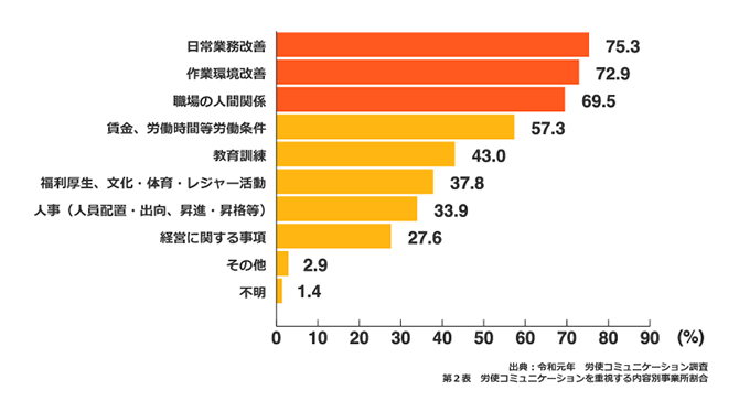 厚生労働省の「令和元年労使コミュニケーション調査」によれば、会社が社内コミュニケーションで重視する内容は、回答が多い順に「日常業務改善」75.3%、「作業環境改善」72.9%、「職場の人間関係」69.5%となっています。社内コミュニケーションの本来の意味である「企業利益」の部分が色濃く反映されていることがよくわかるでしょう。