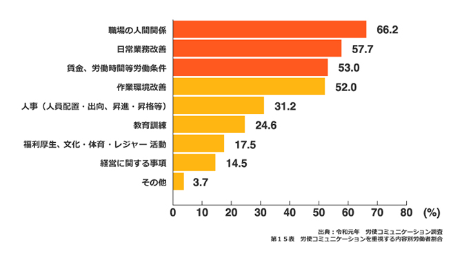 同調査によると、会社が企業利益を重視する一方で従業員が社内コミュニケーションで重視するのは回答の多い順から「職場の人間関係」66.2%、「日常業務改善」57.7%、「賃金、労働時間等 労働条件」53.0%です。これには、「本人の働きやすさ・待遇」の面が強く現れているといえます。