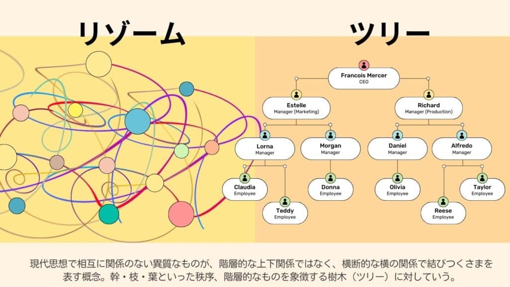 これからの職場は、ピラミッド組織よりのリゾーム組織であることが求められます。リゾームとは、「根茎」と訳され、下で緩く通底し繋がっていても、表面に出てくるときには違うものとして登場するモデルです。これは職場に当てはめるなら、社の理念や目標という点で、共有しながらも、それぞれの部門は高い専門性に裏打ちされ、それぞれ独立して業務を行っているということです。表面だけ見れば、全く違う仕事をしているように見えるそういう部門の集まりが企業と定義されていくでしょう。DAOや自己組織化など、新しい組織やチームモデルは、このリゾームモデルとほぼ相似しています。
