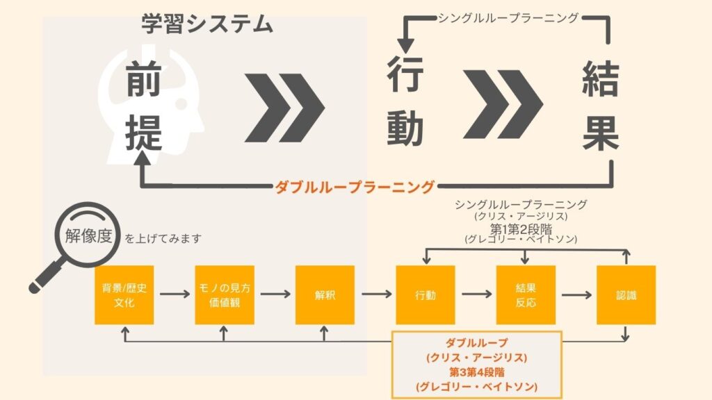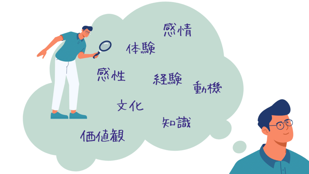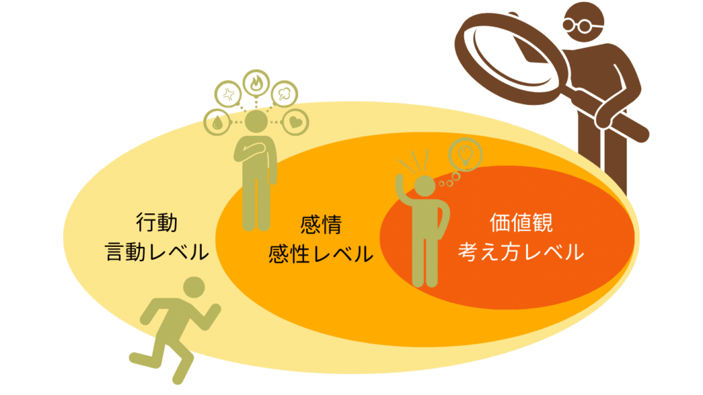 最も深いレベルでは、自分の価値観や信念、思考の枠組み(メンタルモデル)そのものを振り返ります。自分が特定の感情を抱き行動をとる背景には、好き嫌いの感覚や大切にしている考え方といった内面的な前提が潜んでいます。これは単なる知識や情報のように簡単に出し入れできるものではなく、過去の成功・失敗体験の積み重ねによって形成された「ものの見方(メンタルモデル)」です。