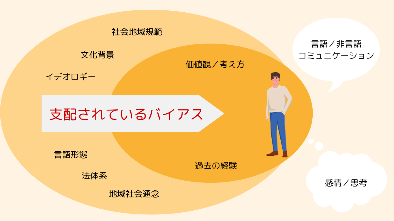 自分自身をドミネイト(支配)しているものは、国や文化、体験や解釈の連続の中で長い年月をかけて練り上げられた重層的なバイアスの構造です。これは、モノを認識する前提になります。これから逃れられない事は自明の理です。つまり、ここを認識する事が重要であり、ここに気づくことが出発点です。これは他者も同様です。