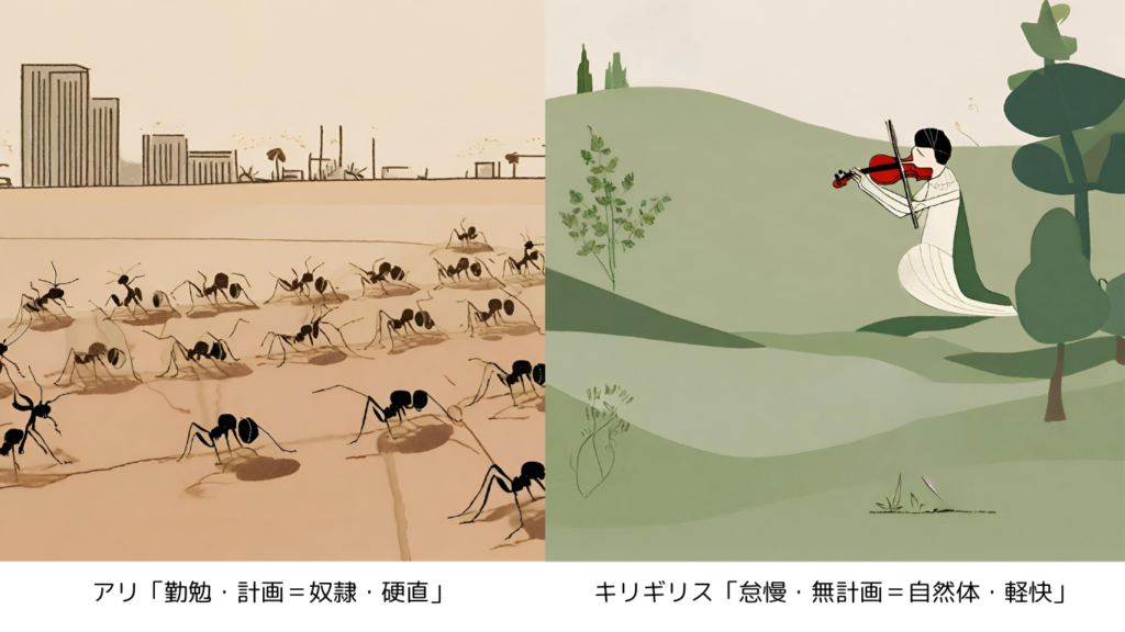 結果的には、キリギリスはアリに助けを求めます。アリが優位であり、キリギリスが劣位というストーリーが強調されます。しかし、その場その場で何とかしていくことは完全に否定できるでしょうか?