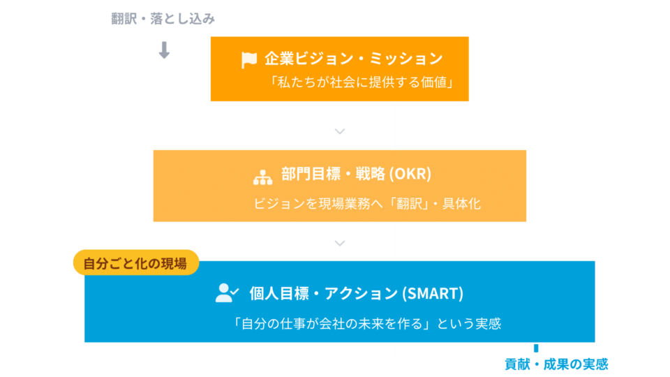 経営層は折に触れてビジョンを語り、それを現場の業務に翻訳して伝える必要があります。さらに、大きなビジョンを各部署・個人レベルの具体的な目標に落とし込むことが重要です。「自分の仕事がどう会社の目標につながるか」が見える化されることで、社員は当事者意識を持ちやすくなります。目標設定の際は、単に数値を課すのではなく、社員自身が納得し「達成したい」と思える形で設定することが大切です。