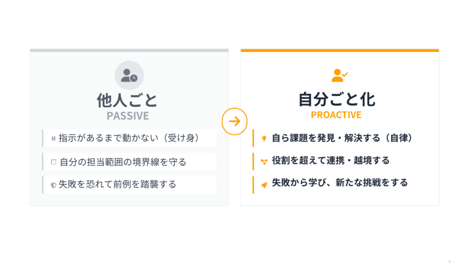 そのため各担当者が自分事として課題に向き合い、上司の指示を待たず行動できることが不可欠となっています。現場レベルで自分ごと化が進めば、素早い対応と現場発の改善が可能になり、組織全体の俊敏性が高まるでしょう。