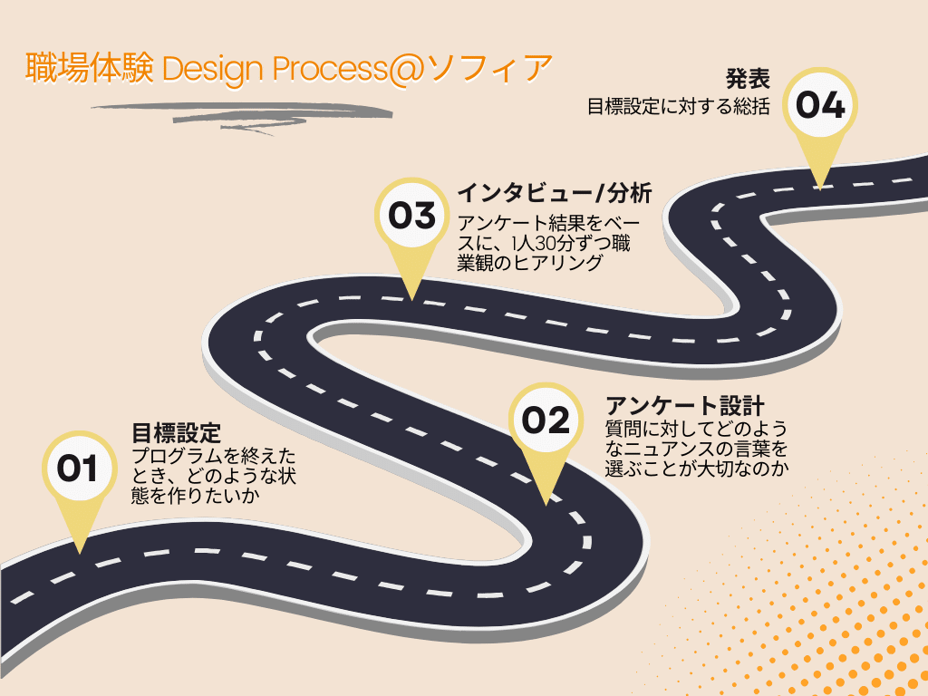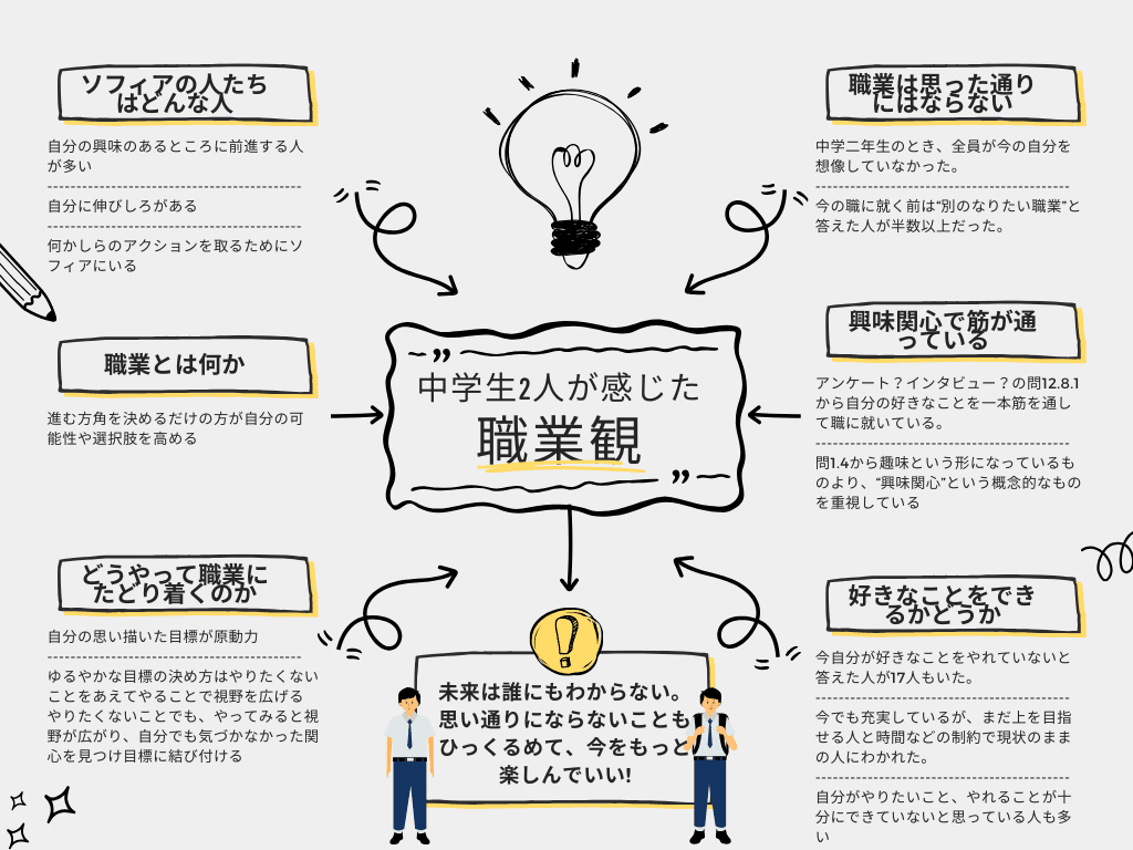 ・「職業観」という、普段仕事や生活している中では特に意識することのない概念に改めて向き合ういい機会でした。また、彼らのアンケート&ヒアリングを通じて、ソフィアメンバーの仕事に対する考え方や捉え方を垣間見ることもできたと思います。
