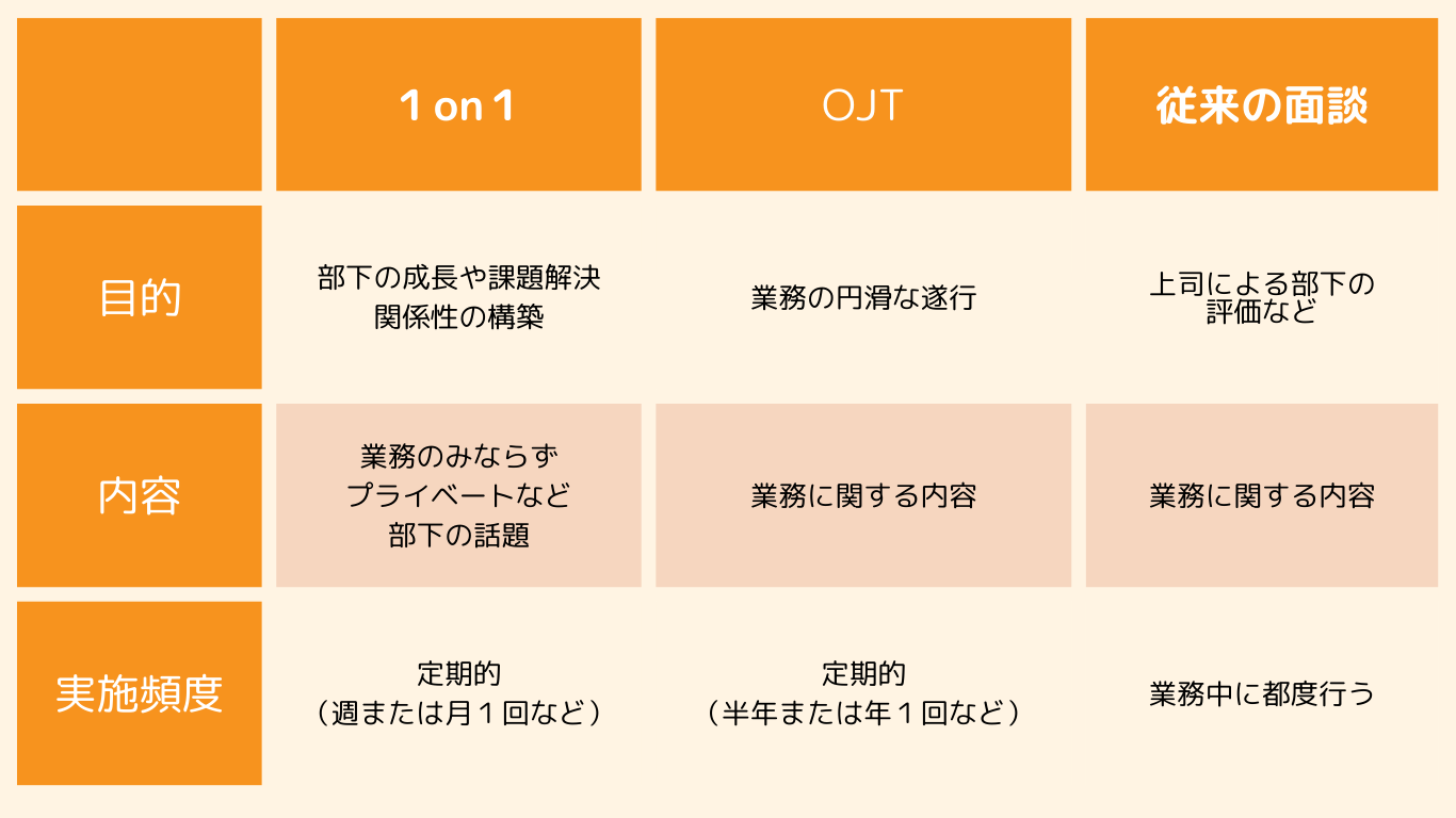 つまり、欧米における1on1と、日本における1on1は、導入の経緯や背景も違うため、自社に導入する際に、自社の課題に沿った形態を模索する必要があります。マネジメントのトレンドという理由だけで導入すれば、現場や管理職から無意味な業務の追加だと批判を受けることもあり注意が必要です。
