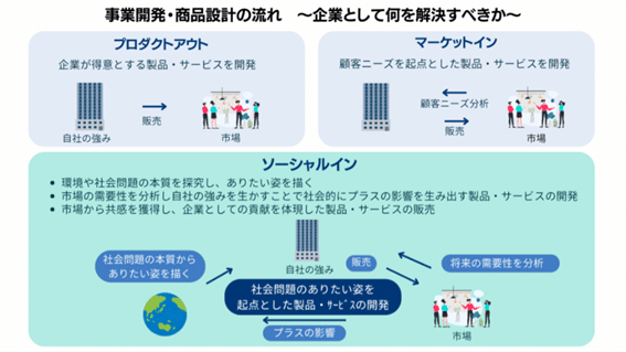 事業創造ではプロダクトアウトからマーケットインへのアプローチの変革が古くから言われています。顧客起点でソリューションを考案するマーケットインの重要性は皆さんも同意のところかと思いますが、サステナビリティ起点の事業創造においては、この起点が社会や環境、もっと広く言えばステークホルダーとなるわけです。このことをソーシャルインと呼びます。