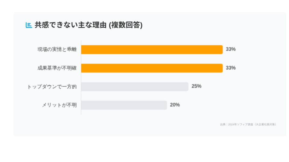 共感できない理由として最も多かったのが「現場の実情や実務と乖離している」(33%)や「成果の評価基準が不明確」(33%)であり、戦略が抽象的すぎて自分の仕事とかけ離れていることが指摘されています。「背景や意図が十分に理解できない」(25%)、「必要なリソースが不足している」(26%)、「報酬やメリットが感じられない」(29%)といった声も上がっており、トップダウンのメッセージが具体性や説明・支援を欠いているために現場の腹落ち感を得られていない実態が浮き彫りとなりました。実際に大企業の79%が社内コミュニケーションに何らかの問題を感じているとも報告されており、サステナビリティ施策も例外ではなく「現場が置き去り」になっているケースが多いのです。