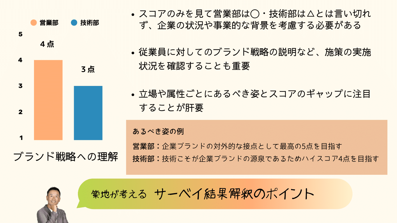 最高点を5点とする「ブランド戦略への理解」について、営業部が4点・技術部が3点というスコアだった場合に、どう解釈するのか。営業部は技術部よりもスコアが良かったので良いマネジメント状況である、技術部はもっと頑張るべきである、ということではないと思っています。企業ブランドの対外的な接点である営業部には最高の5点であってほしいと考えるかもしれませんし、技術こそが企業ブランドの源泉であると考えるならば、やはり技術部にもハイスコアを求めます。企業の思惑や方針と、スコアのギャップを見て考えることが大切です。
