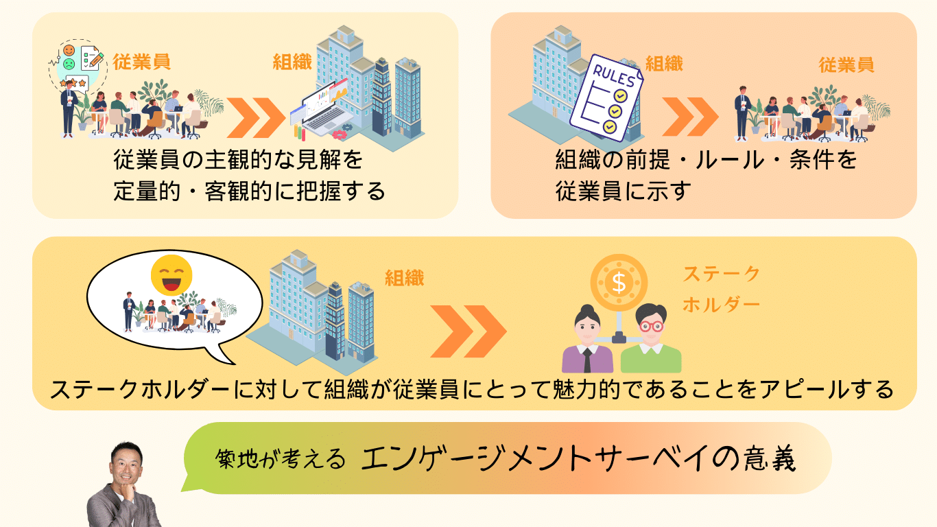 また、「組織と従業員の共通利益を最大化する」という前提に対して、望ましい状態であるか否かの判断材料となるのがエンゲージメントサーベイでもあります。組織としての前提やルール、条件を従業員に示すという意味でも、サーベイは価値があるのではないでしょうか。