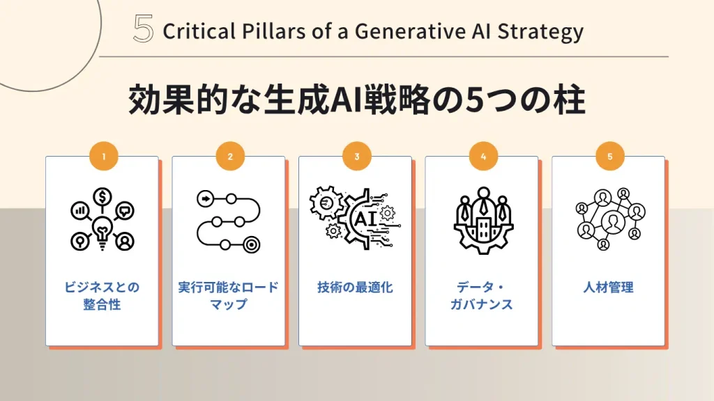 AI戦略は組織のメンバーが新しいAIの取り組みを実施する際に、「情報に基づいた意思決定を行うための明確なフレームワークを提供する」としてAnalytics8社による「生成AI戦略の5つの主要な柱」を引用し、AIの能力を組織の主要なパフォーマンス領域とどのように一致させるかを視覚的に示しています。