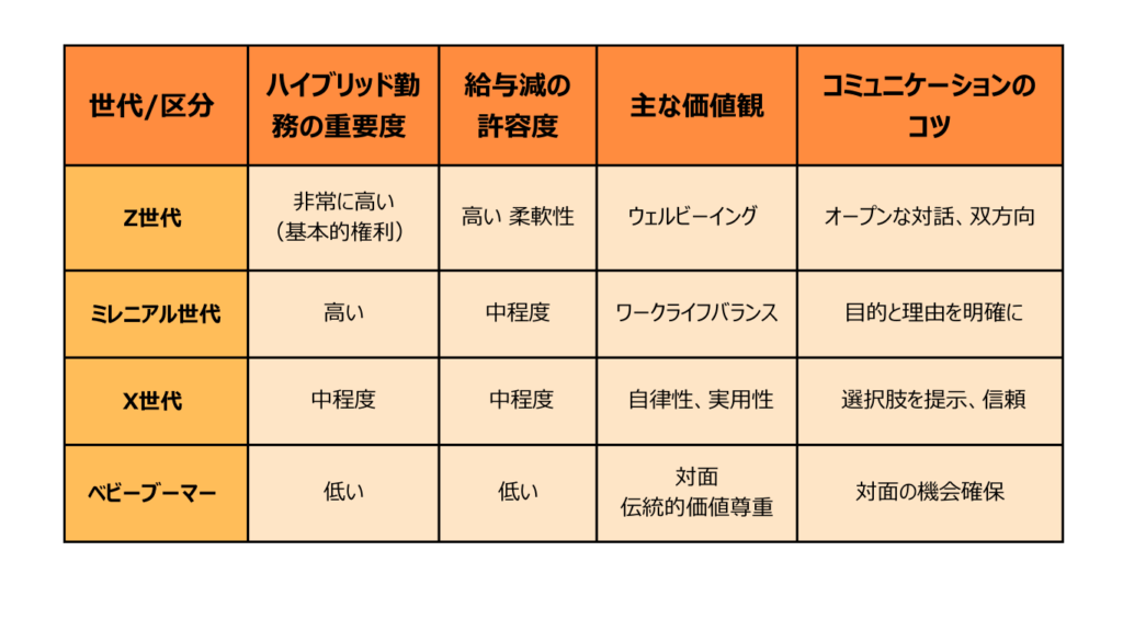 さらに、ハイブリッド勤務の価値は世代間で大きく異なります。Annenberg報告書によれば、Z世代はハイブリッド勤務を「特権ではなく基本的権利」と捉え、給与減を受け入れても維持したいと考えています。一方で、ベビーブーマー世代は給与減の受け入れに最も消極的です。