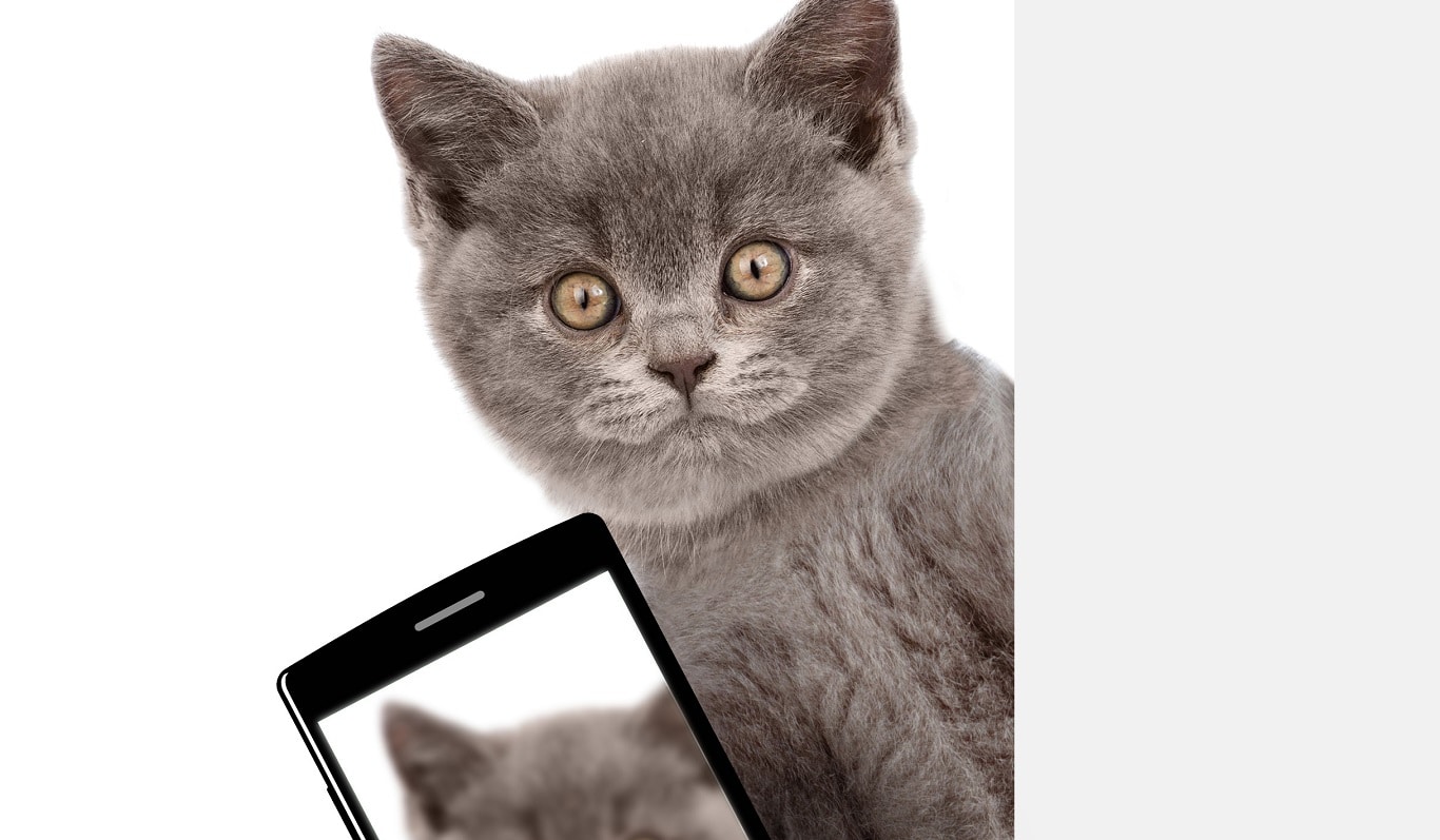 Cat with smartphone peeking above white banner and taking a selfie. Isolated on white background
