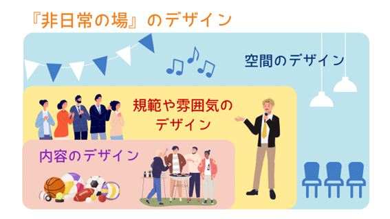とはいえ、アイデアのみで目的が伴っていないイベントを行っても、参加者には「これを会社で行う意味があるのか?」という疑問が生じます。社内コミュニケーションイベントには、目的を踏まえながら従業員をワクワクさせる「非日常の場」のデザインが必要です。以下に、「非日常の場」をデザインするためのポイントを解説していきます。