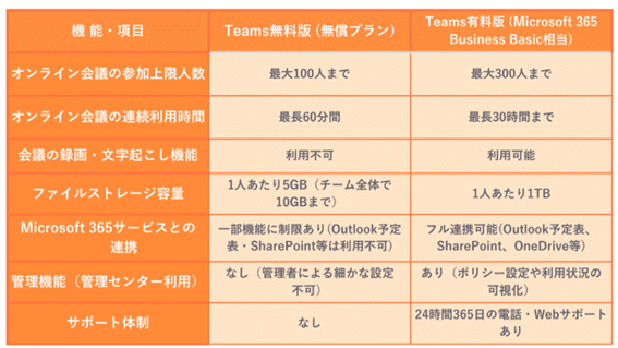 その他にもオンライン会議の規模やストレージ容量、管理機能などに違いがあります。主な相違点を以下の表にまとめました。