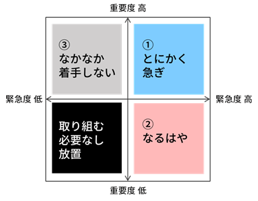 結局のところ、何を本当に必要な仕事なのか、何を優先して取り組むべきなのか、その判断基準がないだけなのだ。私たちは、どうしても緊急度が高い仕事から手を付ける。重要なのはわかるけど(今じゃなくてもいいよね)、という取り組みは、たいてい年度末の自己評価のタイミングでその存在に気付く。(そしてそのまま翌年に引き延ばす、あるいは慌ててとりあえずやっつける)
