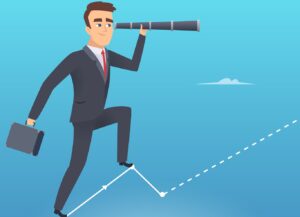 Business vision concept. Male businessman stands on chart looks through telescope professional control corporate growth vector