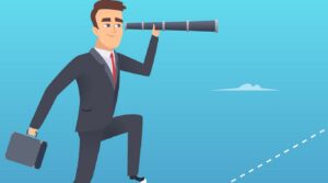 Business vision concept. Male businessman stands on chart looks through telescope professional control corporate growth vector