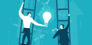 Two businessman competing agains of each other on the professional leader. Getting on top of career. Job, salary, professional opportunity concept. Flat style illustration.
