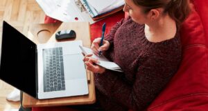 Woman mother working doing her job remotely during video chat call stream online course webinar on laptop from home during COVID-19 quarantine while her daughter watching video on tablet