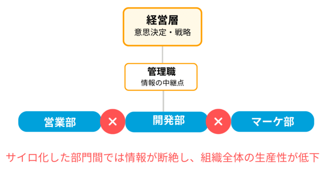 つまり横の連携不足と縦の意思疎通不足が双方で起きているということです。大企業ほど部署ごとの情報共有の壁(いわゆるサイロ化)が厚くなり、デジタルツールを導入しても「部署が違うと大事な情報が回ってこない」という声が上がりがちです。