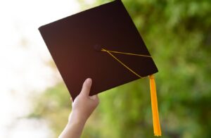 Behind photo of university graduate wears gown and black cap, yellow ribbon