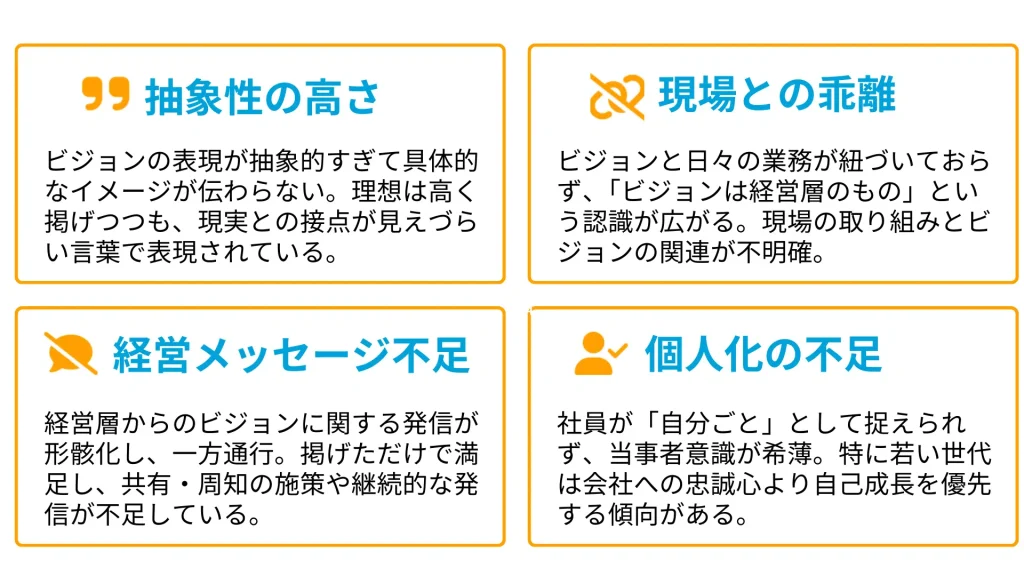 ビジョン浸透の重要性は多くの経営者が認識する一方で、「うちの会社ではビジョンが思うように社内に浸透していない」という声も少なくありません。ここでは、ビジョンが社員に浸透しない主な原因を整理してみましょう。