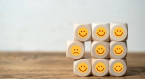Viele Würfel mit lächelnden Smileys und einer der unzufrieden ist