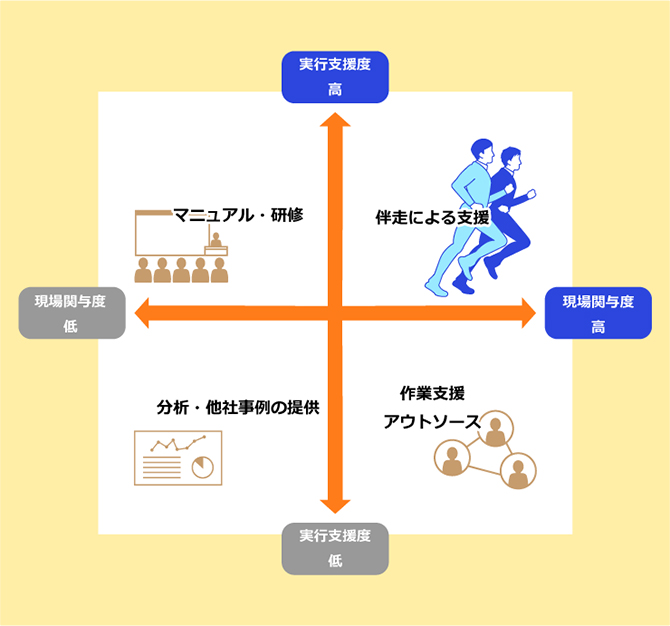 組織課題解決に向けた企業支援の方法は色々ありますが、その中で伴走支援の位置付けは下の図のようなイメージ。外からアドバイスするだけ、作業を手伝うだけではなく、組織に深く関与して、現場を巻き込み、一緒に施策を実行していきます。その分、取り組みを推進する企業の担当者にも、支援する私たちにも、強い覚悟が必要です。