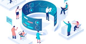 People interacting with charts and analyzing statistics. Data visualization concept. 3d isometric vector illustration.
