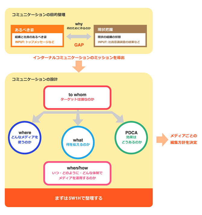 インターナルコミュニケーションの戦略や方針を立てるには、まず目的を整理し、目的を踏まえて設計することが大切です