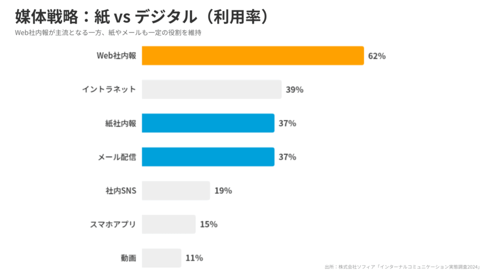 ソフィアが2024年に実施した「インターナルコミュニケーション実態調査2024」によれば、最も多くの企業で活用されている社内広報媒体はWeb社内報(62%)でした。次いで社内ポータルなどのイントラネット(39%)、そして紙社内報(37%)とメール配信型社内報(37%)がほぼ同率で続いています。