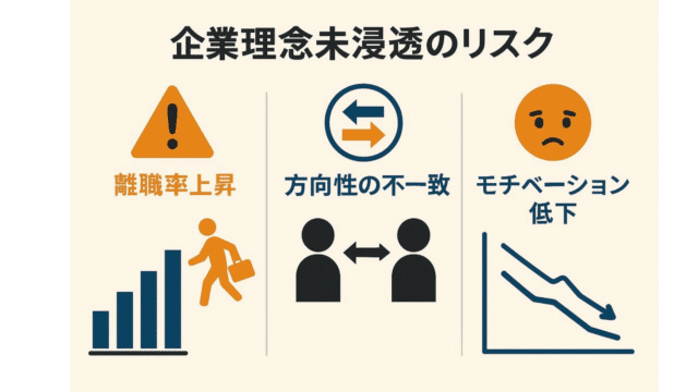 さらに、企業理念が浸透していない職場では従業員のエンゲージメントが低く、離職率が高まる傾向も指摘されています。理念という共通軸がないと「自分の会社は何を大事にしているのか」が社員に伝わらず、働く意義を見失いやすくなるためです。結果として優秀な人材の流出や、人材採用の難航にもつながりかねません。